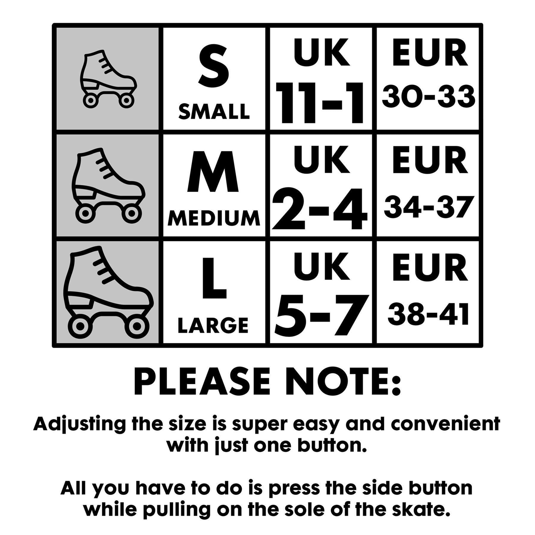 · ADJUSTABLE DESIGN FOR GROWING FEET: GEEZY's quad skates come in stylish colours and feature an easy-to-adjust size mechanism. With a simple button press, kids can extend or retract the front sole, ensuring a comfortable fit as they grow.